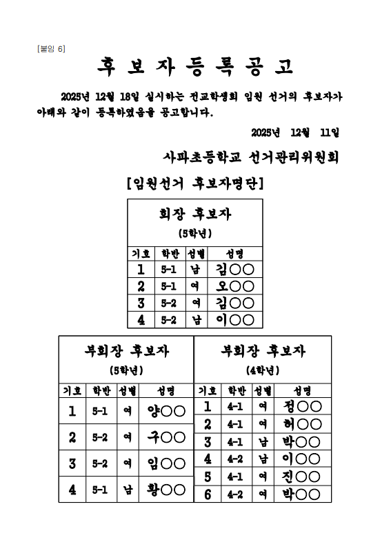 2026학년도 전교학생회 임원 선출 후보자 등록 공고