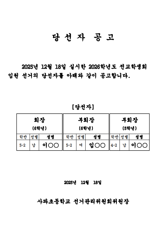 2026학년도 전교학생회 임원 선출 당선자 공고